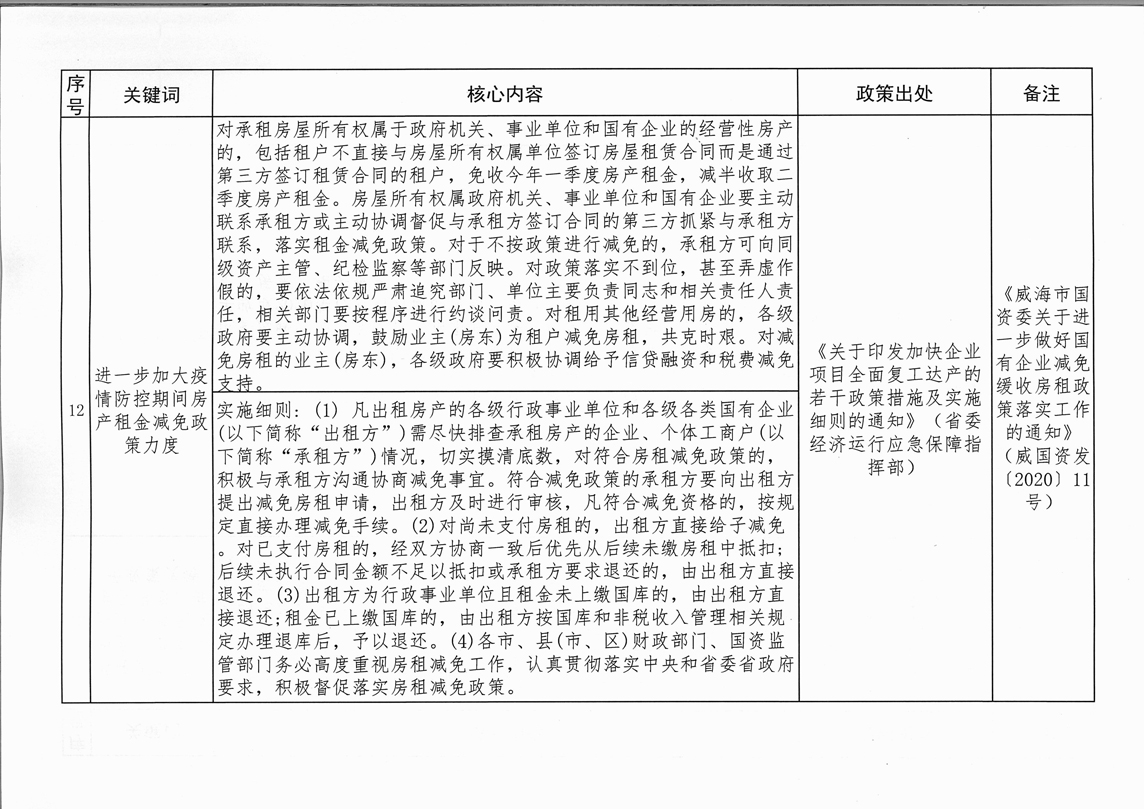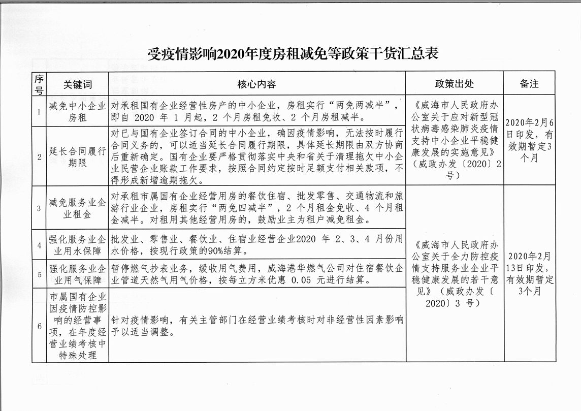 為全面落實“六穩(wěn)”、“六?!比蝿?wù),進一步推動國有企業(yè)房租減免政策落地落實,現(xiàn)將《受疫情影響2020年度房租減免等政策干貨匯總表》及監(jiān)督投訴電話予以公告。