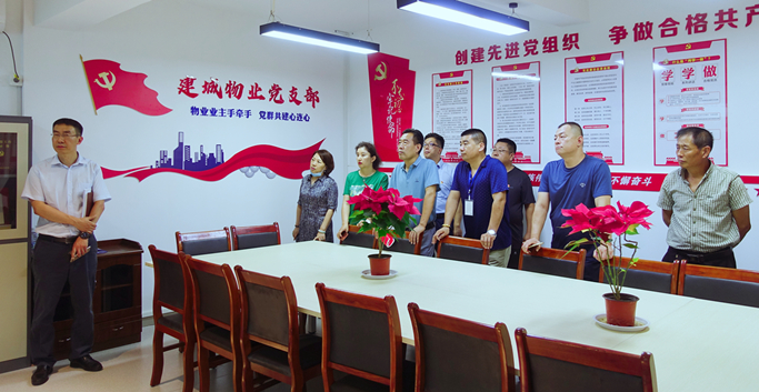 話黨建、共交流、拓思路、謀發(fā)展。為進(jìn)一步加強(qiáng)黨建互動(dòng),積極交流先進(jìn)經(jīng)驗(yàn),切實(shí)提高集團(tuán)黨建工作水平,7月21日,集團(tuán)黨委副書記孫曉東同志、黨委委員呂文秀同志帶隊(duì),組織集團(tuán)黨務(wù)工作者來到建城物業(yè)公司,學(xué)習(xí)觀摩紅色物業(yè)黨建陣地。