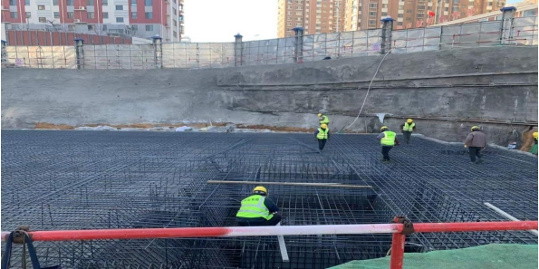 4#樓筏板基礎施工完成,正在綁扎地下2層剪力墻鋼筋及模板支護工作;