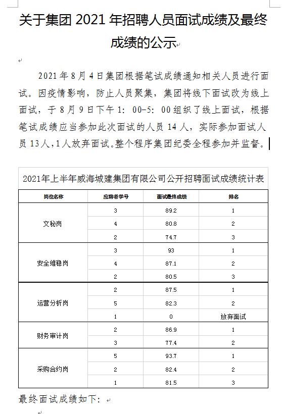 威海城建集團(tuán)2021年招聘人員面試成績(jī)及最終成績(jī)的公示